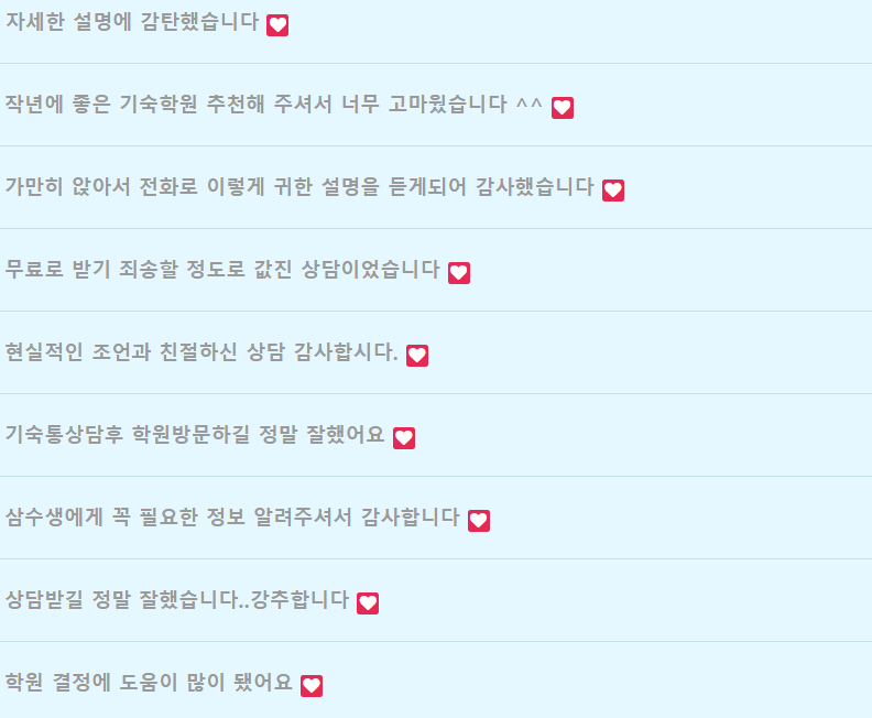 지금까지 기숙학원을 추천하는 이유와 고르는 방법에 대해 알려드렸습니다. 재수학원은 많은 비용이 들기 때문에 섣불리 결정하지 마시고 이 글을 참고하셔서 상담받으시고 신중하게 선택하셨으면 좋겠습니다.