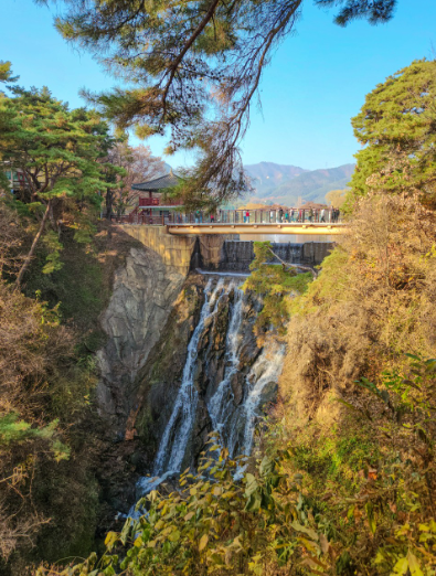 그중에서 용추 폭포는 많은 사람들이 찾는 포토 스폿입니다. 가을에 단풍과 함께 떨어지는 폭포를 보고 있으면 신선놀음과 다름이 없습니다.